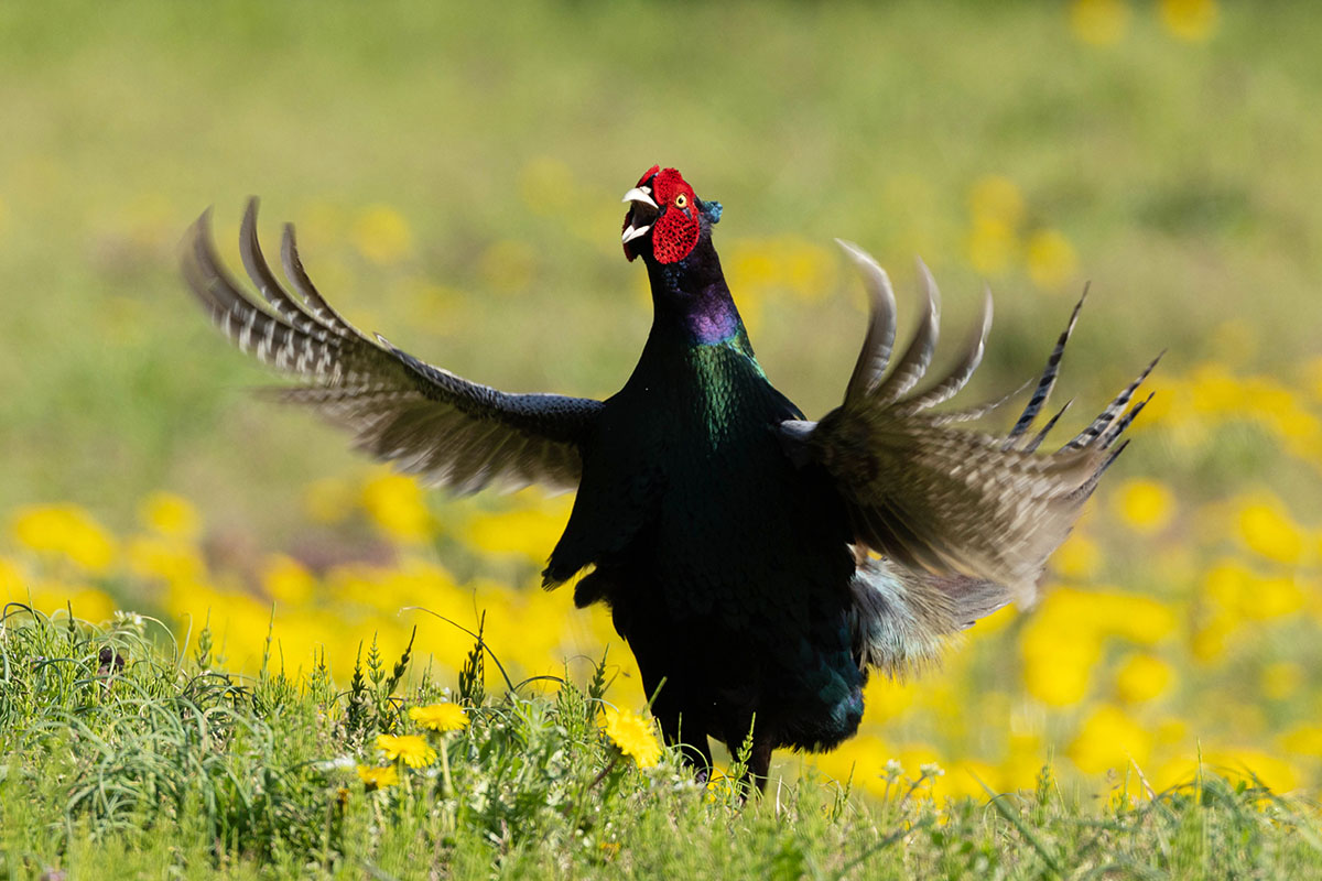 Green pheasants are not strong fliers. Instead, they prefer to stay hidden among fields and reed beds. Males are especially striking, with long tail feathers, an iridescent green body reminiscent of a peacock, and a vivid red face. During the breeding season (April to July), the red fleshy patches on their faces swell into a heart-like shape. To assert their territory, males call loudly and then beat their wings in a rhythmic display.