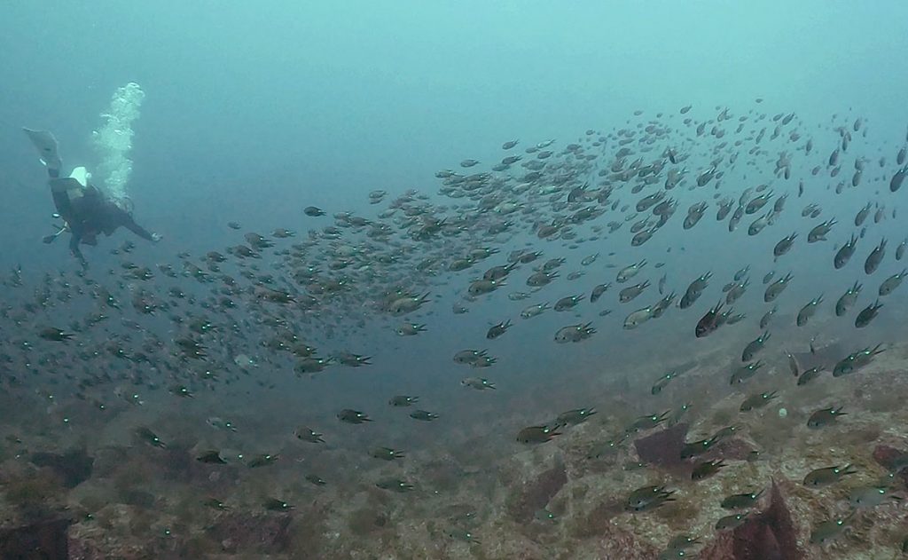 Guided by diving instructor Hiroyuki Koide from the diving service Freeway, I headed to a spot known for its schools of black damselfish. It didn't take long before we encountered a massive swarm.