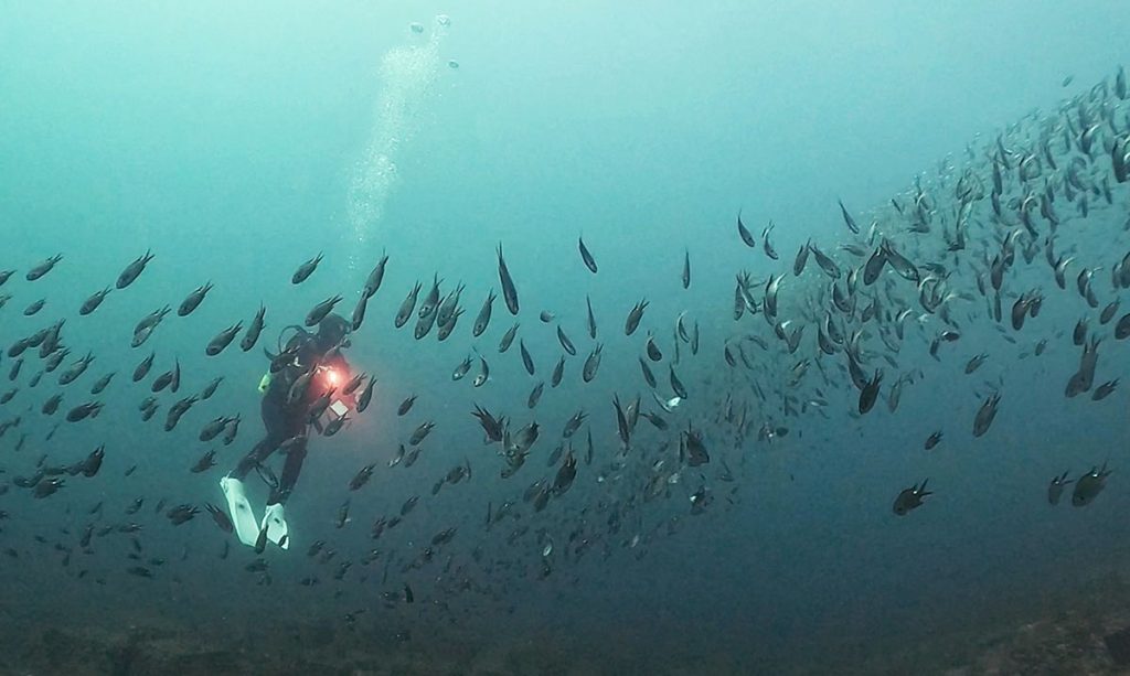 Thousands of damselfish moved together as if forming a path through the water, swaying gently with the current. Even when divers approached, they didn't scatter. I couldn't help but want to follow their shimmering path deeper into the sea.