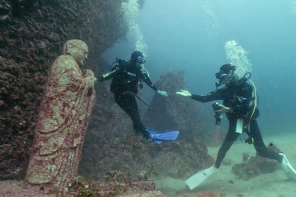 This dive site is also known for a submerged jizo stone statue. Including its pedestal, it stands about two meters tall and was placed there roughly 40 years ago to pray for safety at sea. Despite decades underwater, it remains in remarkably good condition, as if watching over divers and keeping them safe.