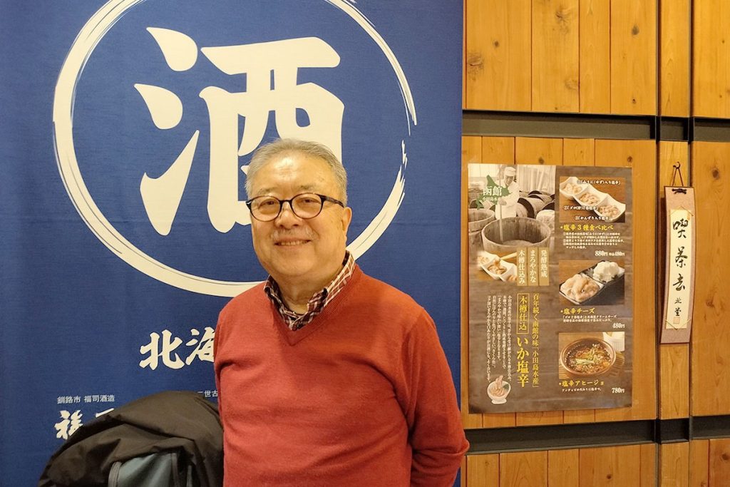 Sugawara smiling in front of Ezo-mae Soba and Butadon Hokudo. (©JAPAN Forward by Mika Sugiura)