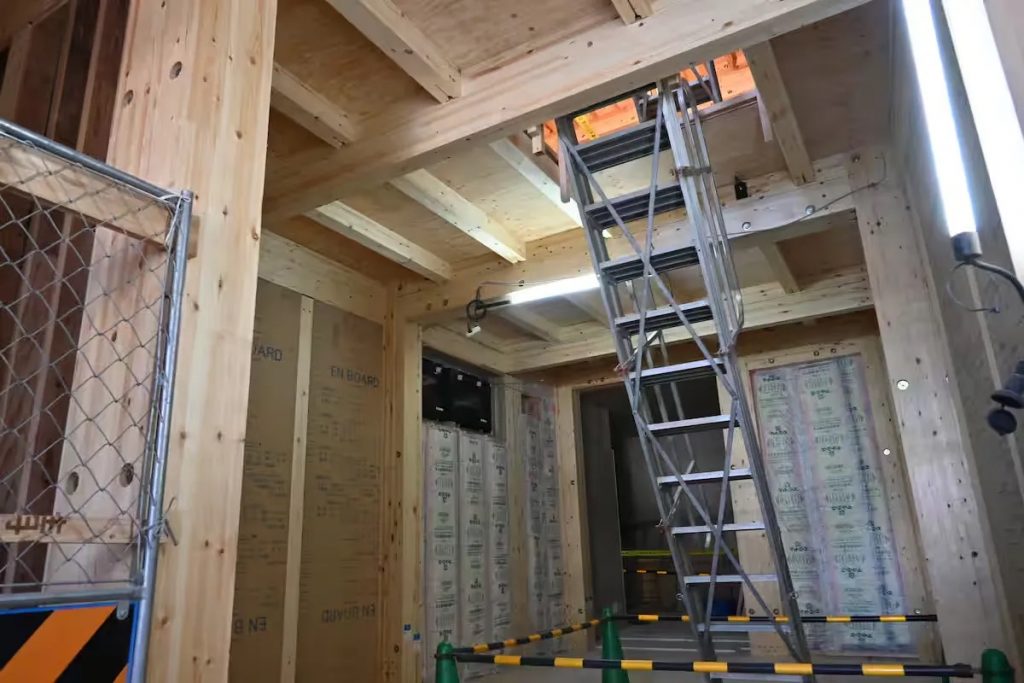 In Hakata Ward, Fukuoka City, construction is underway on a five-story wooden building tentatively named the Kamikawabata Building. Set to house retail space, the interior is filled with the scent of wood, creating a calm, welcoming atmosphere for visitors.