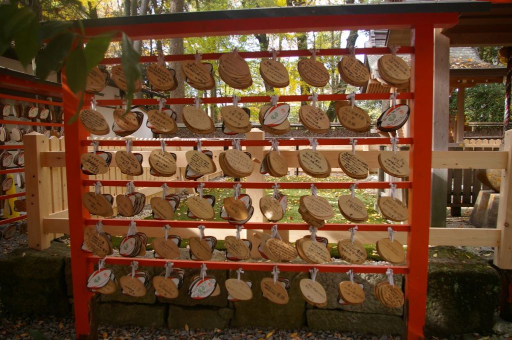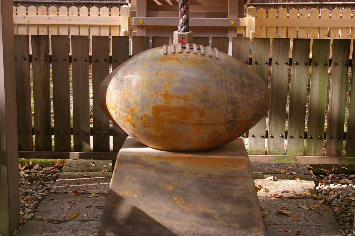 The offering box in the center of the shrine is shaped like a rugby ball, as are the wooden ema (votive plaques). Written on the ema are prayers from players and fans to the gods for their respective teams' success.