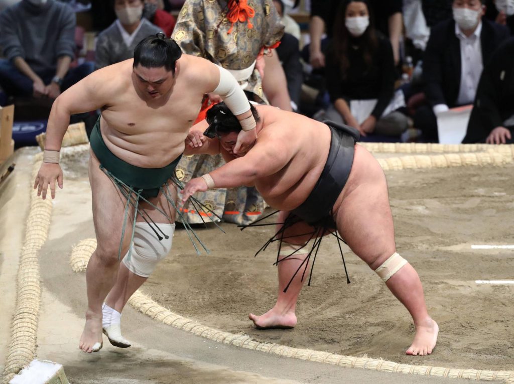 In the day’s penultimate bout, Kumamoto native Shodai put a halt to a two-bout losing skid when he got a double-inside position on Takarafuji (3-4) and drove the fourth-ranked maegashira out to pick up his fourth win against three losses.