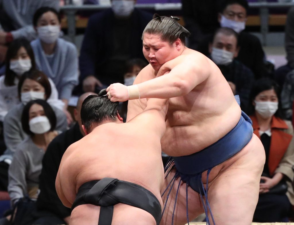 Kyushu native Shodai turned in a crowd-pleasing performance and improved to 5-3 when he used a right-hand thrust down to dispatch struggling No. 3 maegashira Myogiryu, who lost his fifth straight bout and dropped to 2-6.