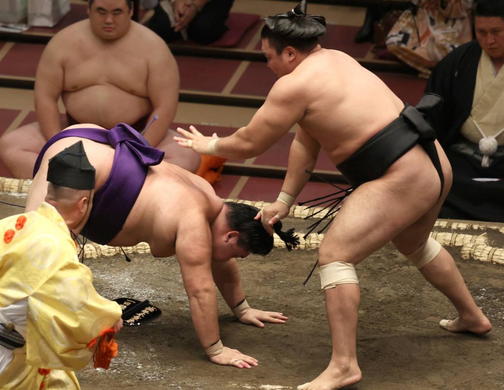 Elsewhere, No. 10 maegashira Myogiryu stayed tied for the lead at 4-0 when he used a series of powerful arm thrusts to overpower Georgian Toshinoshin, a 12th-ranked maegashira who dropped to 1-3.