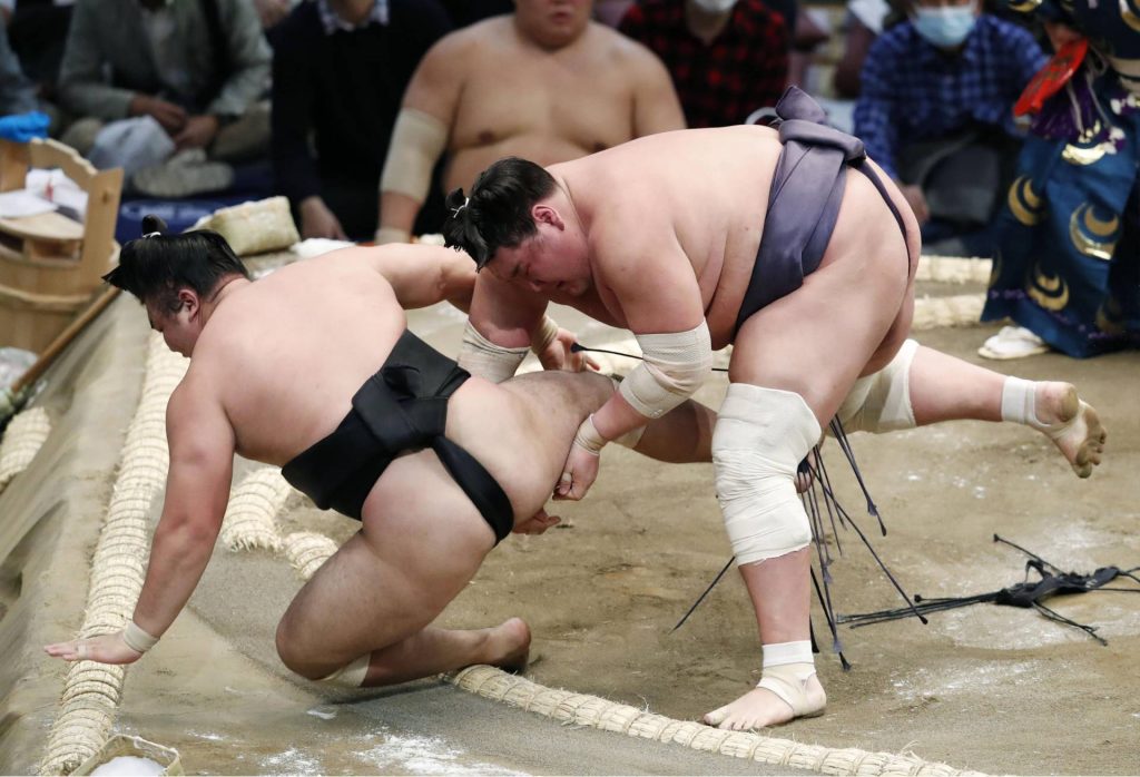Top maegashira Daieisho, who won the New Year tournament, came bursting out of the face-off and used a powerful arm thrust to the neck to stun Shodai and send the ozeki out over the straw ridge.