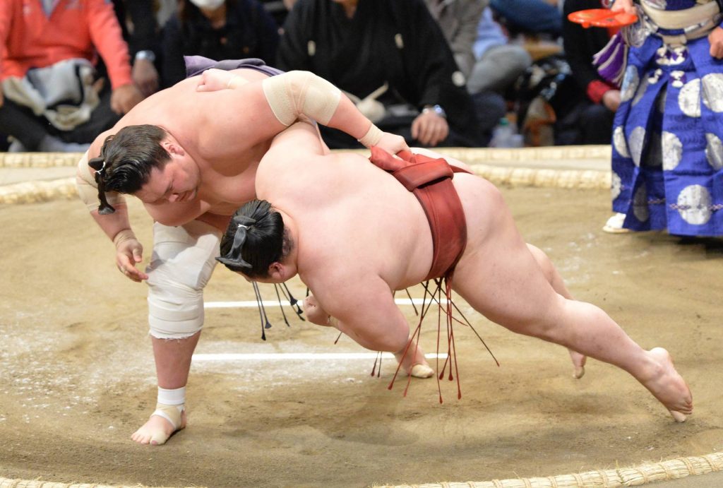 Mitakeumi (4-1) got a grip on the belt and forced his opponent back to the edge, but the top maegashira turned the tables on his opponent and forced him out to pick up his second win against three losses.