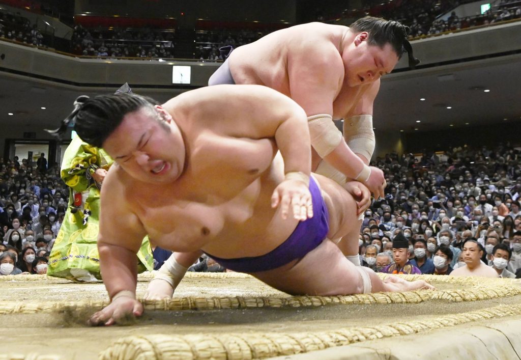 In an all ozeki showdown featuring two wrestlers desperate to win, Mitakeumi got both arms around Shodai and used a frontal force-out to improve to 6-7.